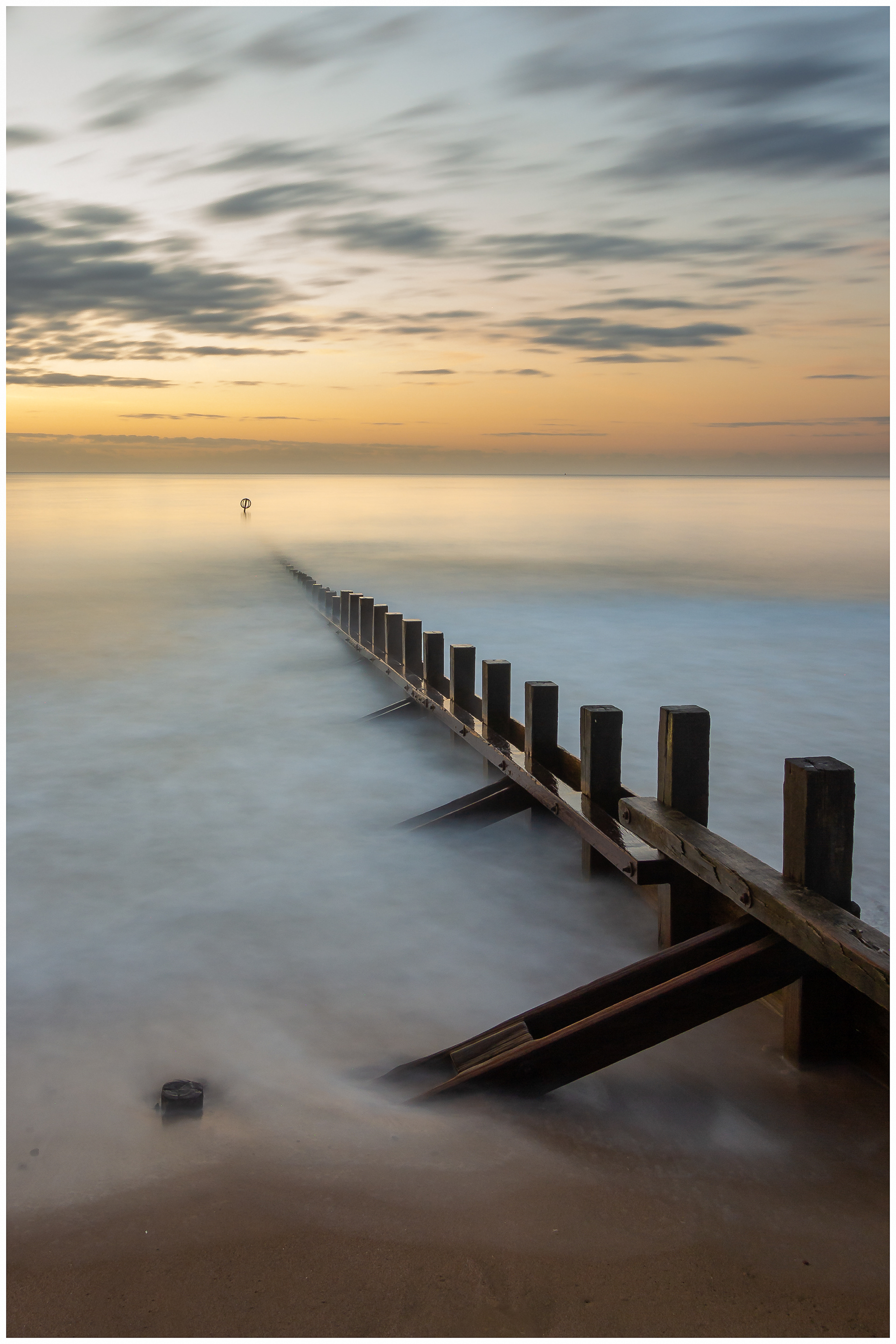 At dawn on Aberdeen beach, the groyne becomes a quiet gesture leading into the soft expanse of sea and sky. The long exposure smooths the water into a gentle haze, revealing the structure not as an obstacle but as a line of stillness within the unfolding light. The muted colours of morning — pale gold, soft blue, and the first warmth of day — create a sense of calm that balances presence with absence.