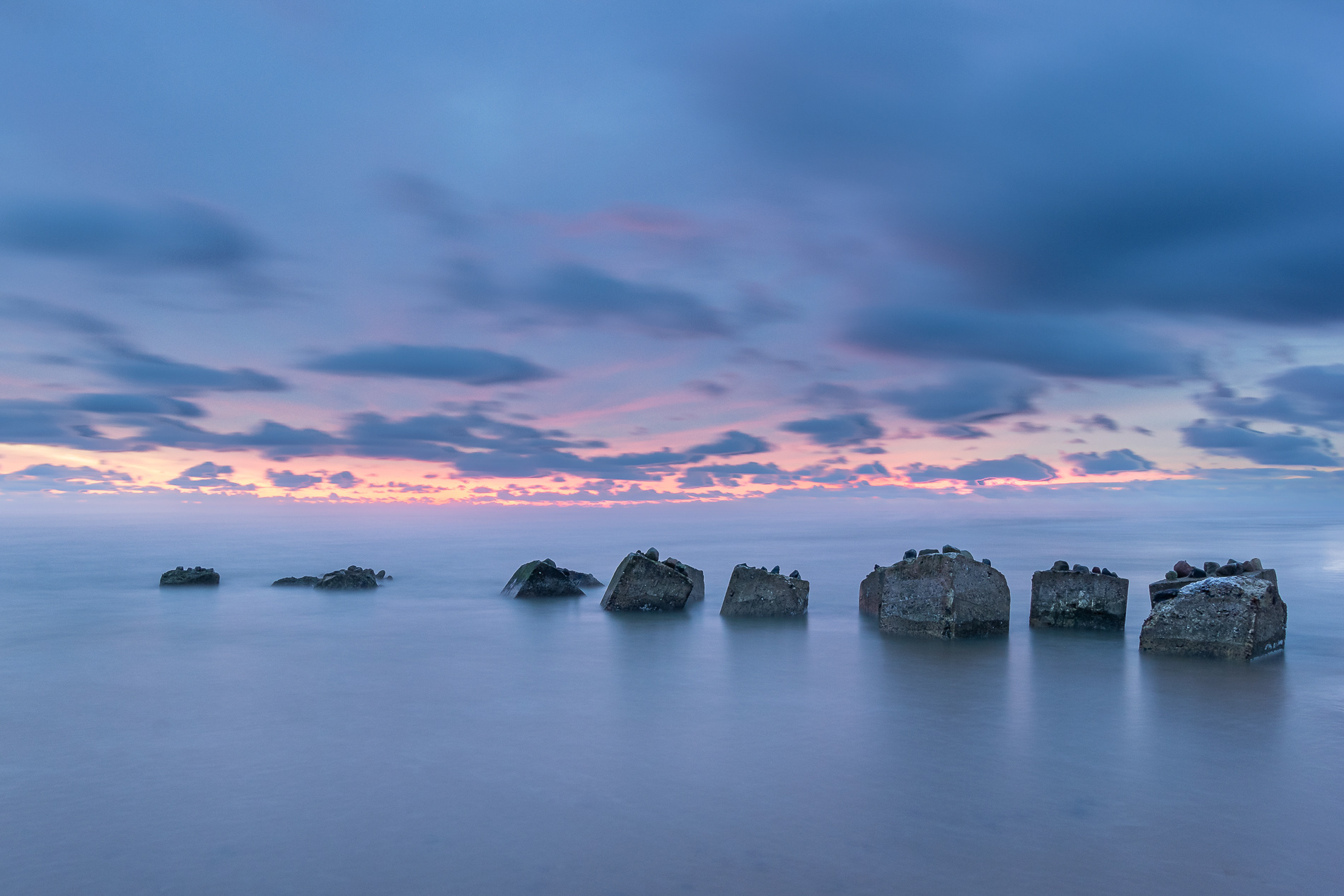 A row of abandoned sea defences rises gently from the tide, reduced now to quiet shapes holding their place against the horizon. In the soft light before dawn, their purpose fades and only form remains — simple, repeating, almost meditative.