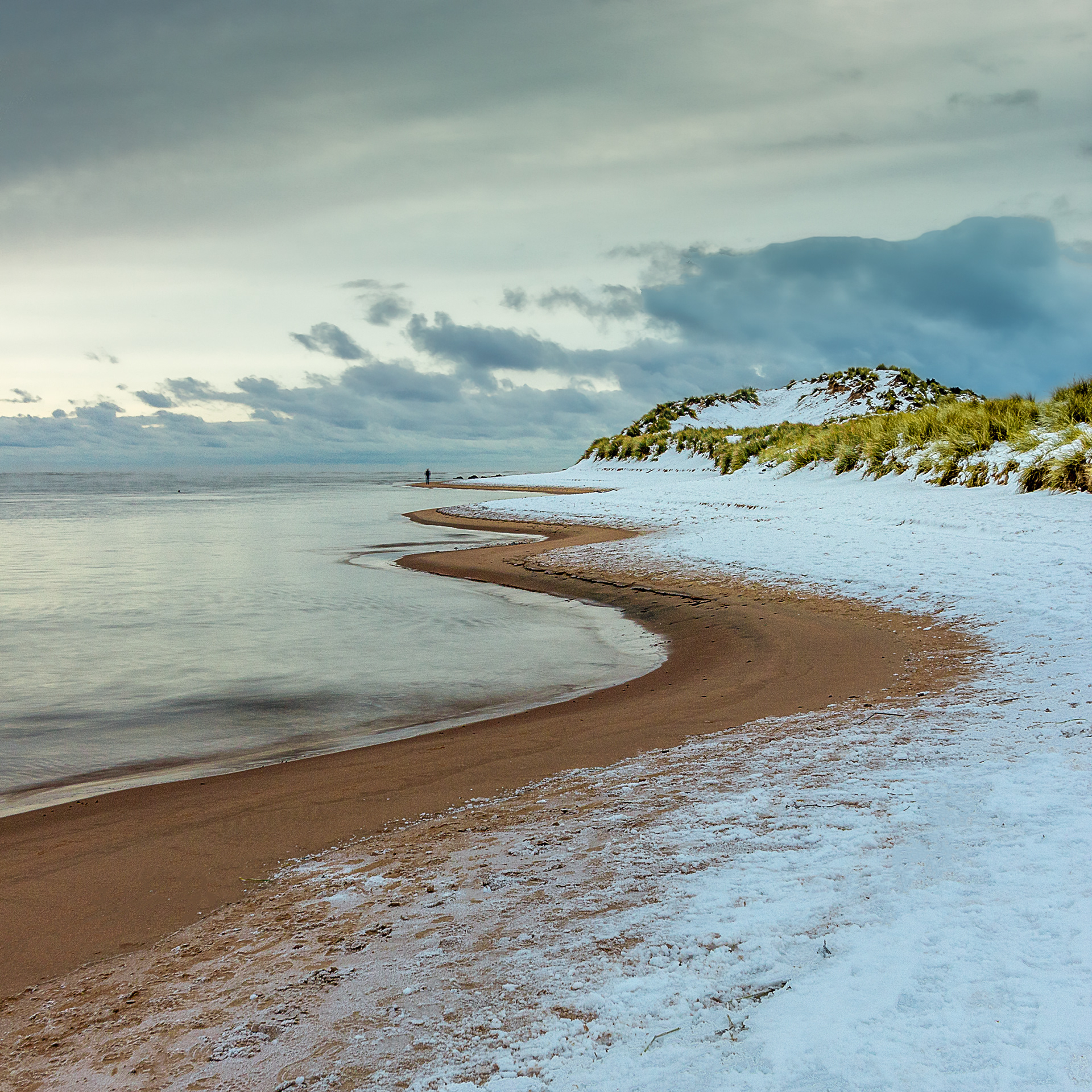 Along a snow-dusted shoreline, the land softens into a single sweeping gesture — a quiet curve where snow, sand, sea, and sky settle into harmony. The stillness feels almost weightless, as though the world has paused just long enough to be noticed. This photograph was awarded the John Muir Trust Landscape Prize 2023, recognising its celebration of simplicity, space, and the gentle clarity that winter brings.