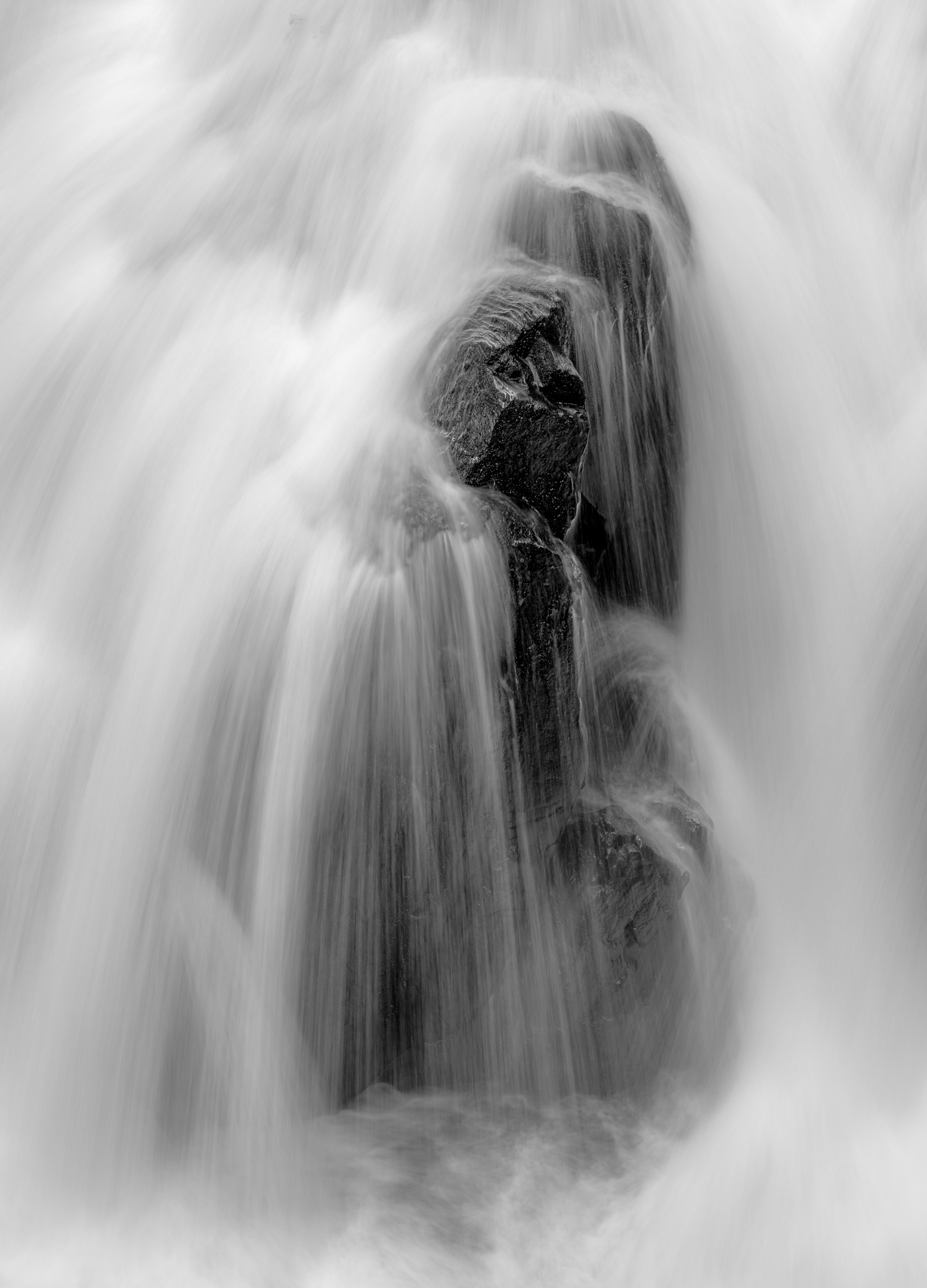 This close study of a waterfall gently reverses expectation: the rock, not the water, becomes the focal point. The cascade slips over its surface in soft, luminous veils, tracing the contours and textures that time has shaped. By isolating this moment, the image reveals how movement can illuminate stillness — a quiet dialogue between permanence and flow, held in a frame of simplicity.