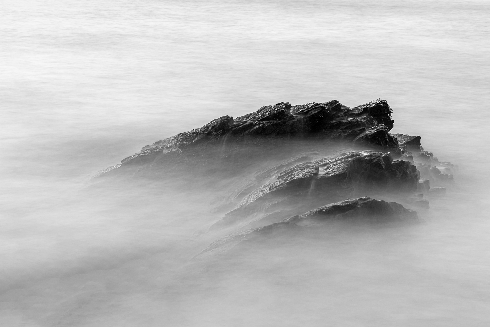 Long exposure transforms this jagged outcrop into something otherworldly — a dark, grasping form rising through a veil of mist. The rock’s natural ridges and fractures resemble the joints of some great submerged creature, frozen mid-emergence. In the surrounding softness, the sea loses its familiar texture and becomes an indistinct, shifting field of light, heightening the sense of mystery.