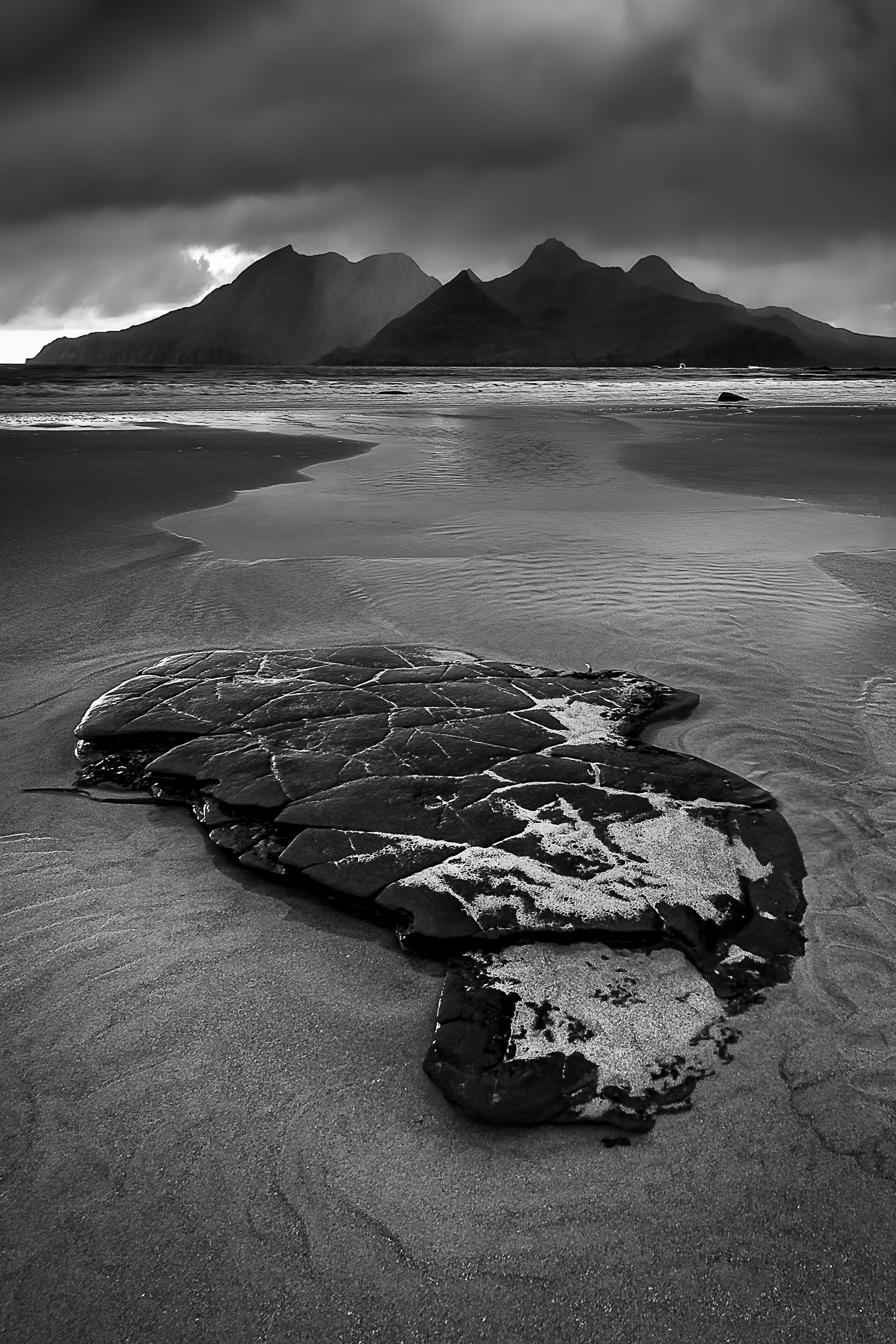 Shot from the shores of Eigg, “Rum on the Rock” brings together two contrasting elements of the landscape: the cracked, weather-worn slab in the foreground and the distant silhouette of Rum rising beneath heavy skies. The rock anchors the scene with texture and permanence, while the island hovers across the water — dark, atmospheric, and almost unreal beneath the shifting cloud.