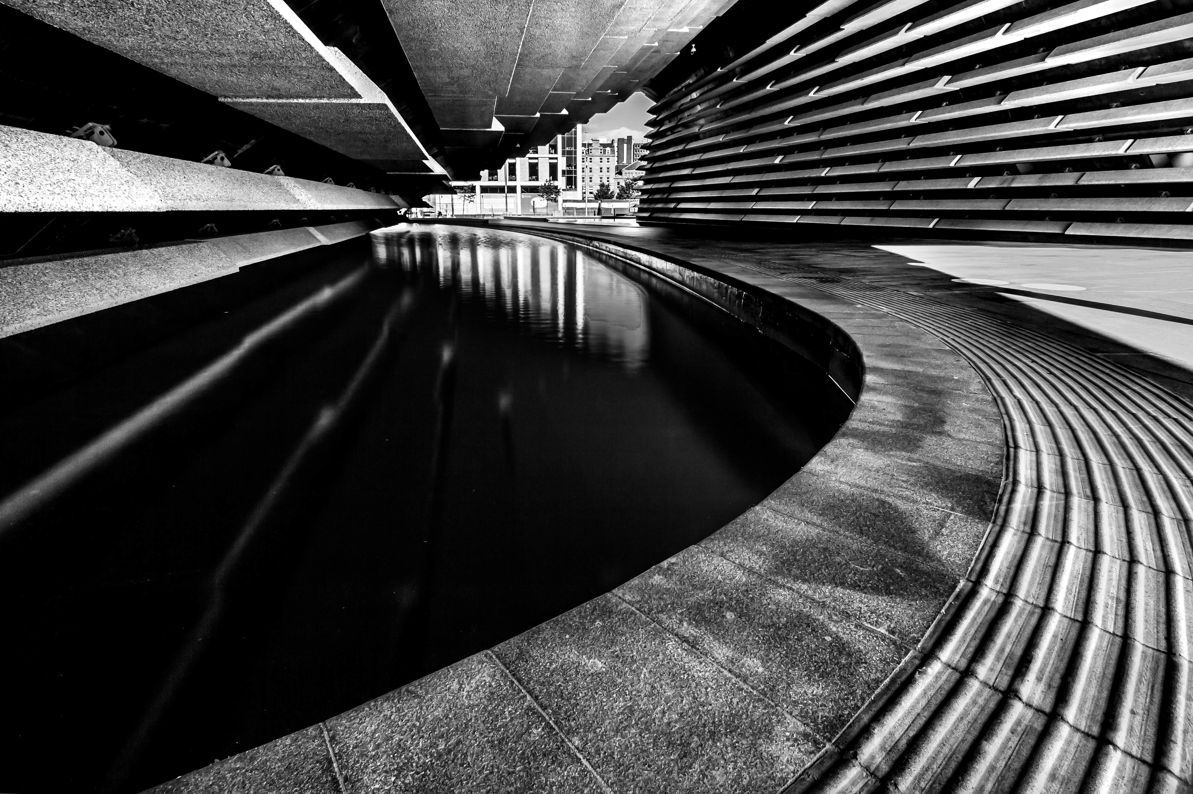 The V&A Dundee reveals a different personality from below — a world of shadow, water, and sculpted geometry. In this quiet perspective, the building’s dramatic forms become abstract rhythms of stone and light, curving and folding toward the city beyond. The reflection pool acts as a dark mirror, softening the architecture’s sharpness and drawing the eye along its fluid path. This image explores the balance between tension and calm, where modern design meets the stillness of an unexpected viewpoint.