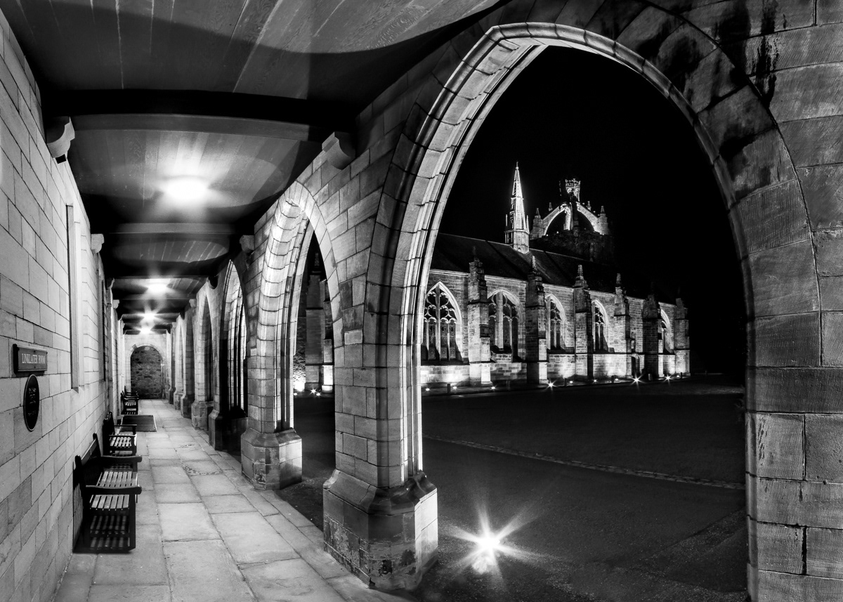 Beneath the vaulted stone, night gathers like a held breath. Light spills along the arches in slow, deliberate strokes, guiding the eye toward the crown tower rising in quiet splendour.