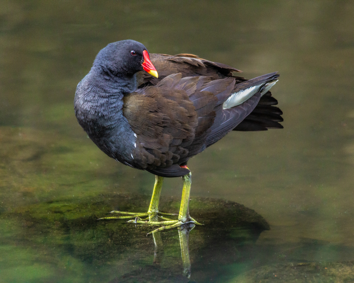 A moment of quiet character on the water’s edge. This moorhen pauses mid-preen, offering a sideways glance that feels almost conversational. In the stillness of the pond, every detail becomes intimate — the soft textures of plumage, the delicate lift of its reflection, the subtle play of colour against calm water. A small, quiet encounter that reveals the gentle personality of a bird so often overlooked.