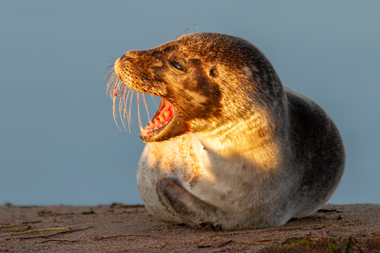 Bathed in the low warmth of dawn, this young seal greets the day with an unguarded yawn — a fleeting, tender moment where wildness feels disarmingly familiar. The golden light catches each whisker, softening the ruggedness of the coast and revealing a creature both resilient and playful. In this brief sigh of morning stillness, the boundary between observer and wild dissolves, leaving only the quiet honesty of first light and a life lived entirely on nature’s terms.