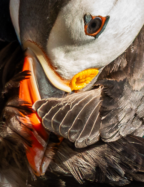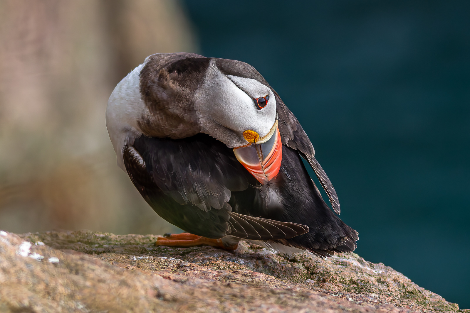 In a rare moment of stillness along the cliff edge, this puffin pauses to tend its feathers — a quiet ritual often overlooked amid the noise and motion of seabird colonies. The soft light and shallow depth of field draw attention to the delicate textures of plumage and bill, revealing the gentle, intimate side of a species better known for its vivid colours and lively energy.