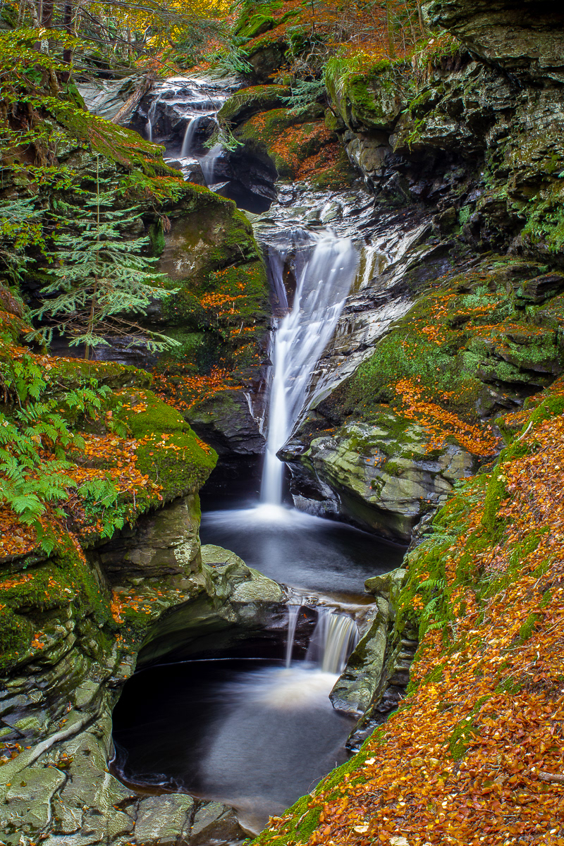 Hidden within a steep woodland gorge, Acharn Falls descends through a series of sculpted rock pools, each one shaped by centuries of flowing water. Moss, fern, and autumn leaves frame the cascading steps, softening the rugged stone with warm colour and texture. The long exposure reveals the water’s quiet rhythm — not a roar, but a continuous, patient movement through the heart of the forest.