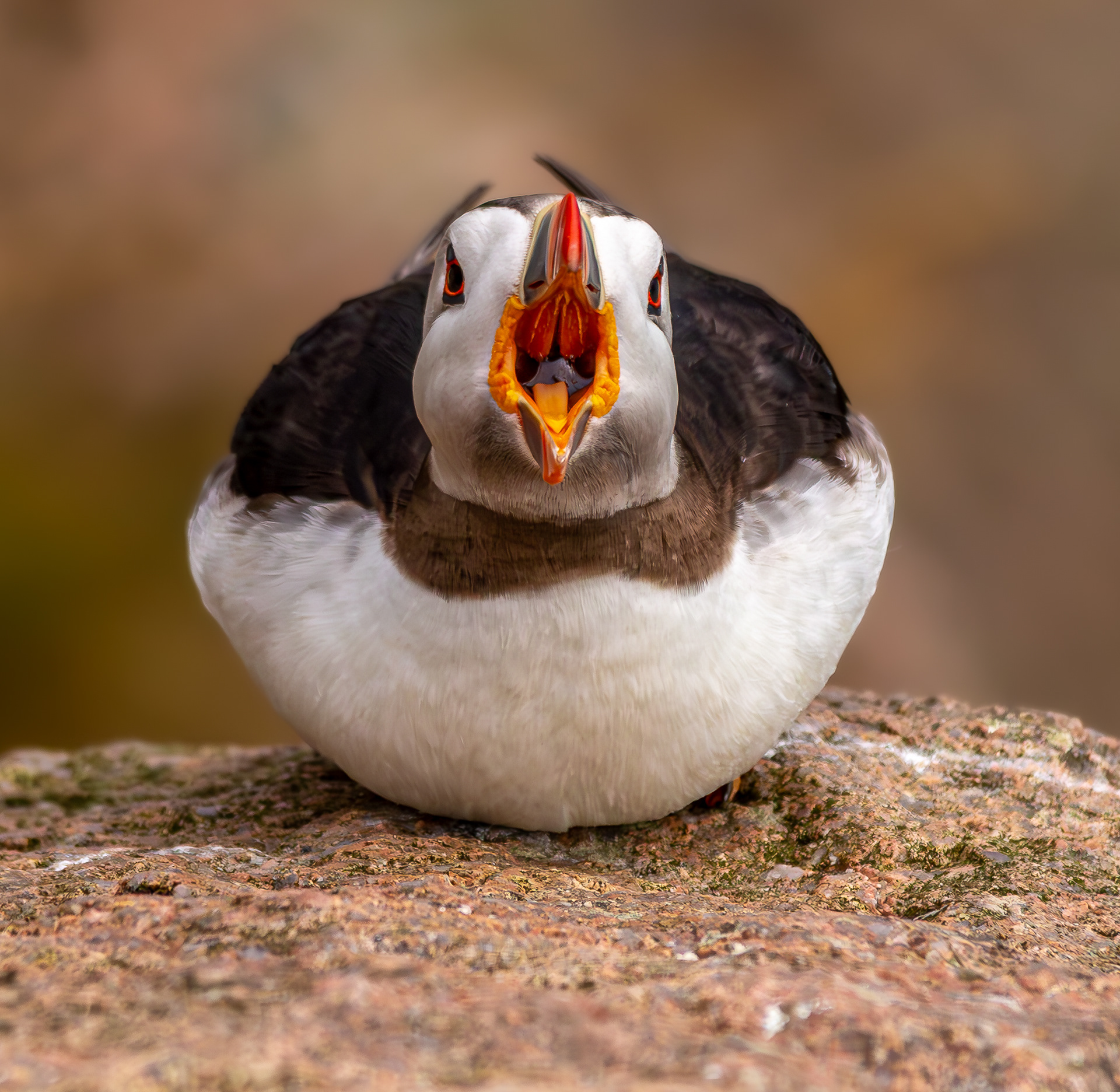 A puffin caught mid-call, full of character and unfiltered expression. In this moment of wild honesty, the bird becomes more than a subject — it becomes a voice on the cliff edge, animated and unapologetically alive.